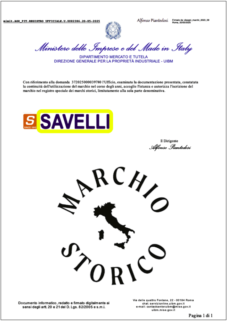 Come rappresentante della 6a generazione della famiglia Savelli, sono lieto ed orgoglioso di annunciare che la denominazione SAVELLI è stata iscritta nel registro speciale dei marchi storici dal Ministero delle Imprese e del Made in Italy (UIBM).